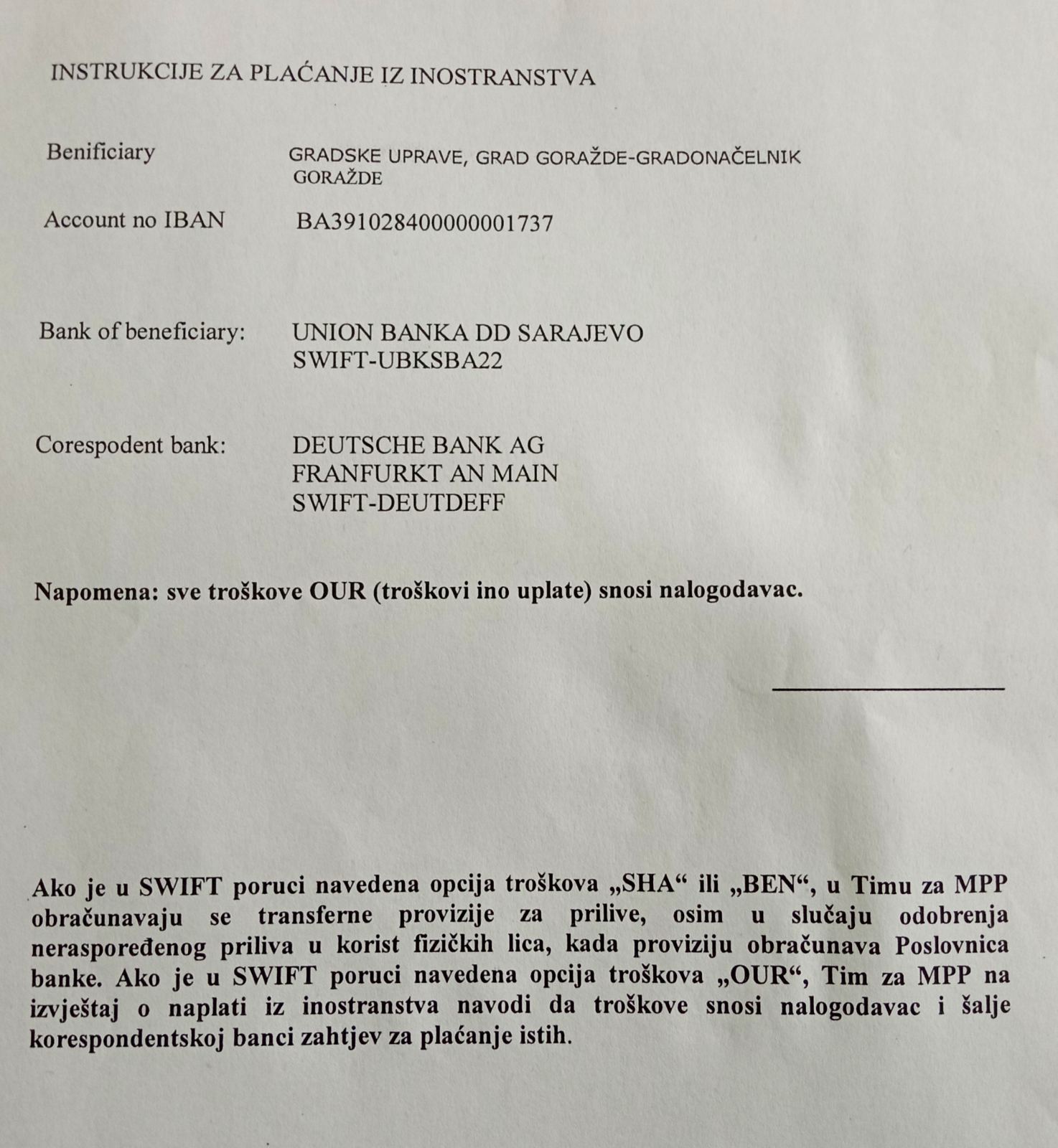 Instrukcije za plaćanja iz inostranstva